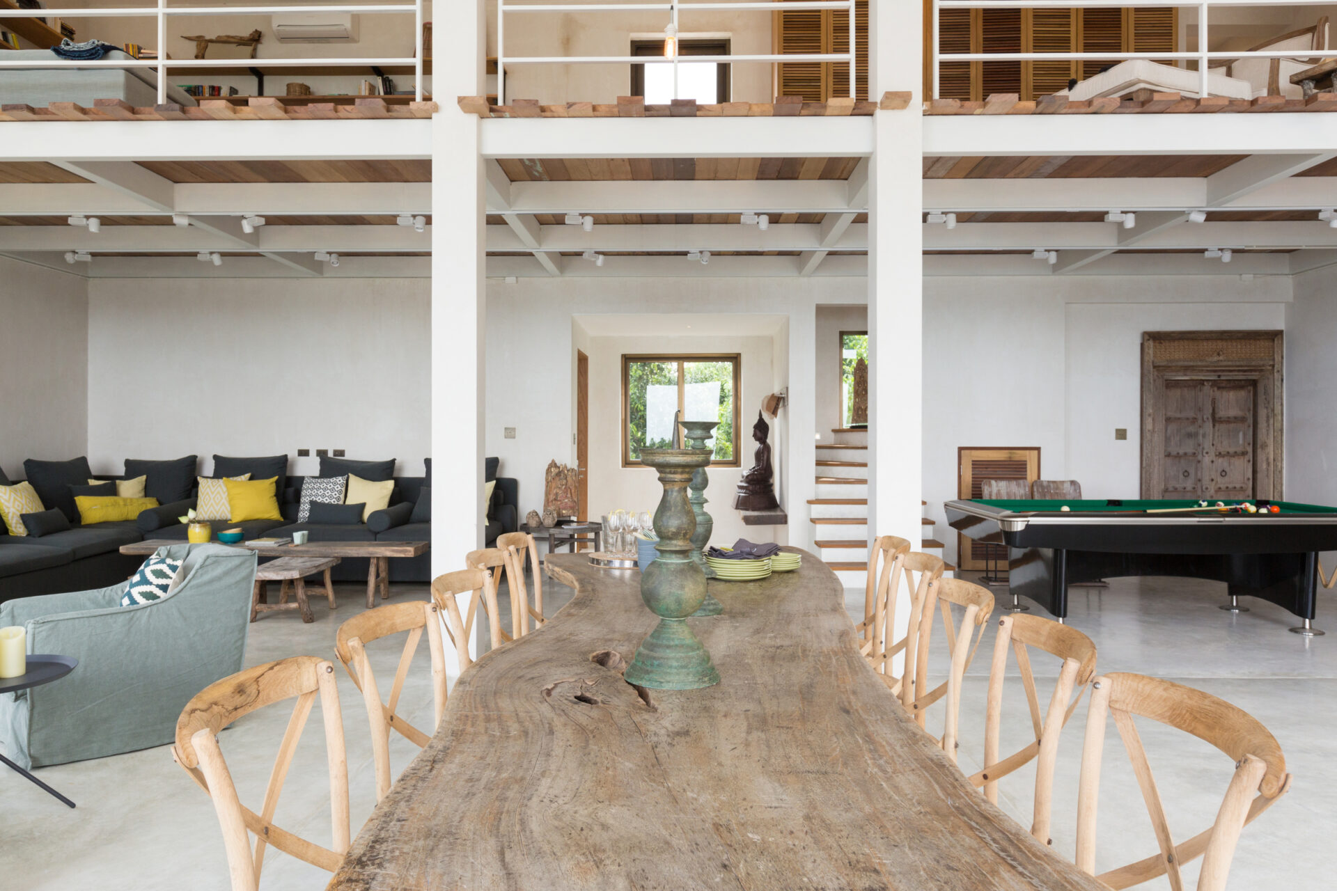 From the living room, wooden stairs lead up to the mezzanine floor (with floorboards made from reclaimed teak wood) where you’ll find the library with business centre – if you simply must catch up on some work while away. Features include a Kelim carpet, bespoke couches, and walls of books to while-away your time. The master suite leads off from the library, and offers ocean views from the bed as well as the private terrace, complete with outdoor shower. The en-suite bathroom boasts his-and-hers marble vanities, as well as a double rain shower. Below the main living pavilion lies a multi-purpose room, which can be used as a TV-lounge, a massage room, or even an additional sleeping area, should the eight bedrooms not be enough for your party.