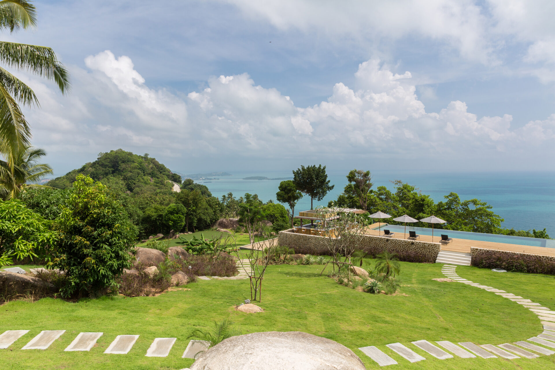 Situated below the main house, taking centre stage in the garden, and boasting exceptional sea views, the expansive infinity pool is sunken into a wooden deck, and is flanked with plenty of sun-loungers and deck chairs. To one side lies a pool bar, along with a separate dining sala, and to other side, a covered pool lounge offers shaded seating to enjoy calm resting or movie watching with video projector and 3m widescreen. The pool terrace, with its many seating areas, makes an ideal place to gather in the day as a group. Bluetooth speakers located around the pool (as well as in the main building, terrace and courtyard) allow guests to play their own choice of music easily via their phones. Koh Koon’s vast lawns are great for children to run, play and be children, and in the garden below the pool, guests can enjoy a friendly game of petanque boules court, or practice their golfing techniques on the putting green.
