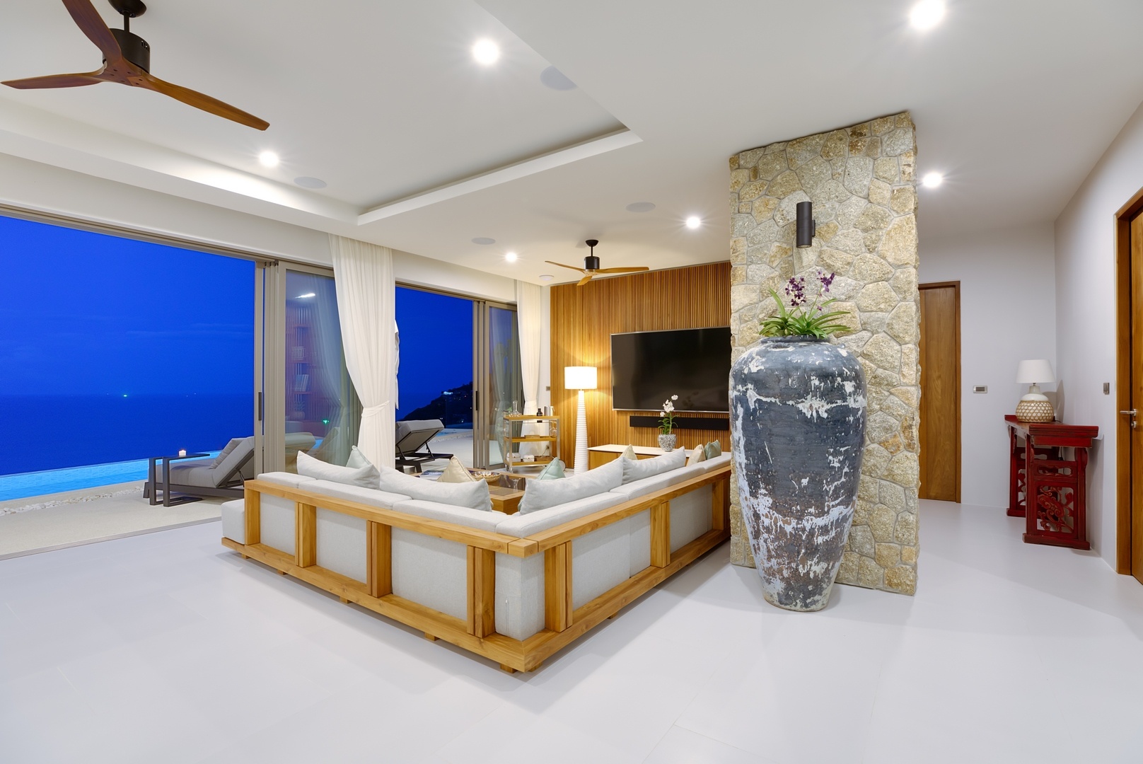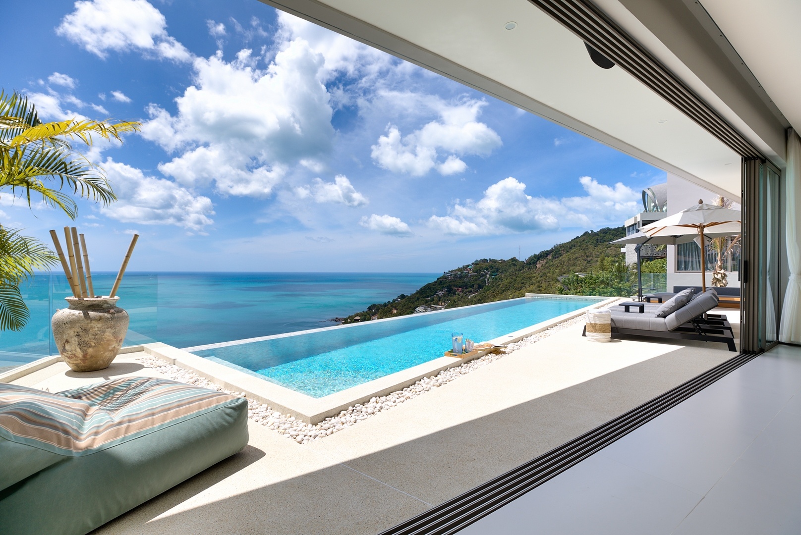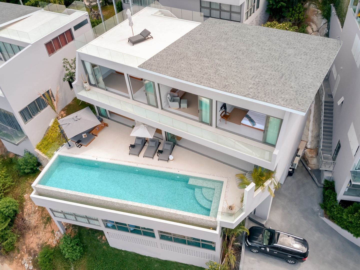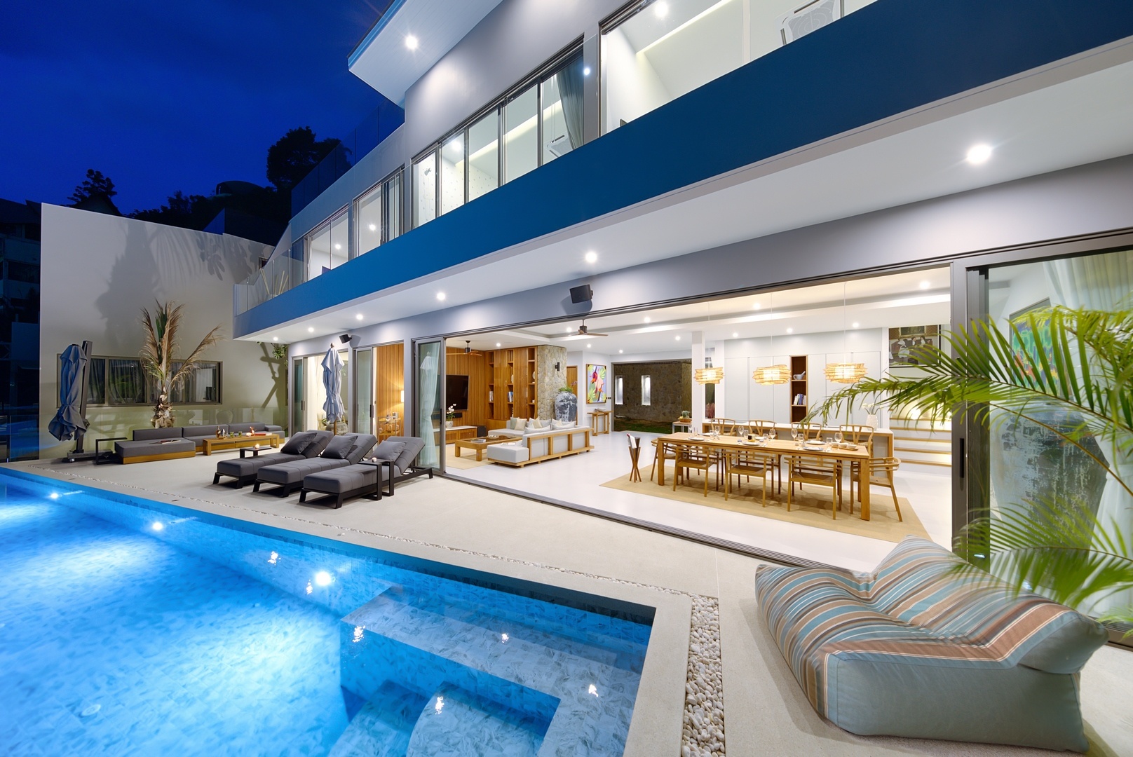 Built over 3 levels with additional roof terrace space, Villa Charal was completed in May 2021 and hosts 5 double en-suite bedrooms, high-end fitness room, hi-spec cinema room with additional staff room, staff kitchen and staff bathroom over 1096 sqm of built space and 600sqm of interior living space.