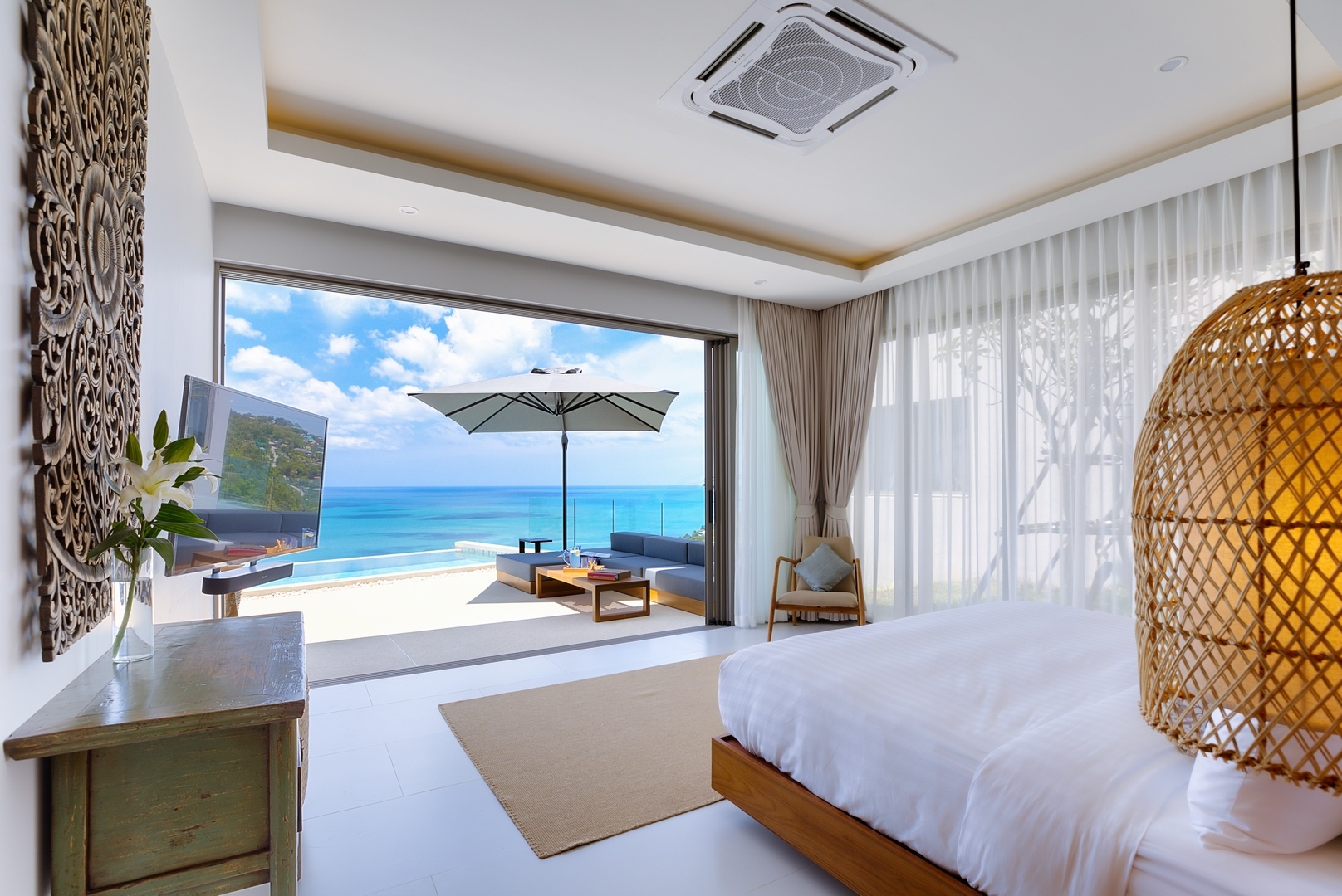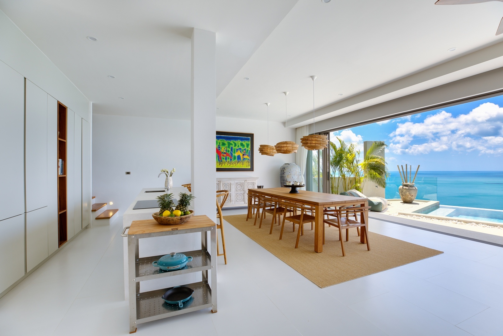Stairs lead up to the open plan living area and kitchen opening onto pool terrace through fully sliding doors accessing the infinity pool and dramatic unobstructed sea views. This level also hosts the second en-suite bedroom and additional shared bathroom.