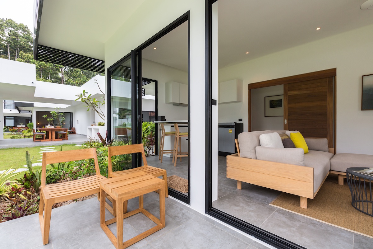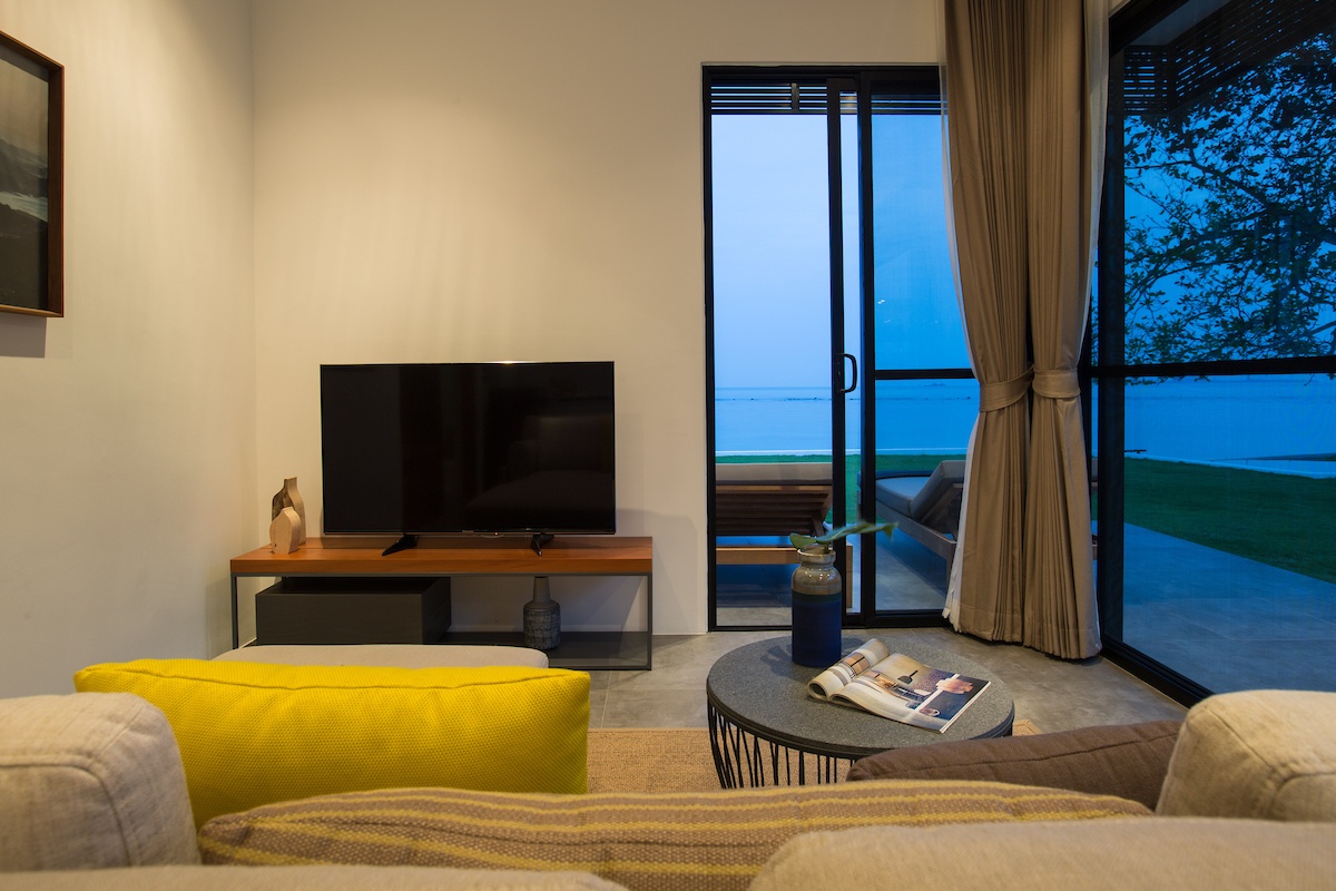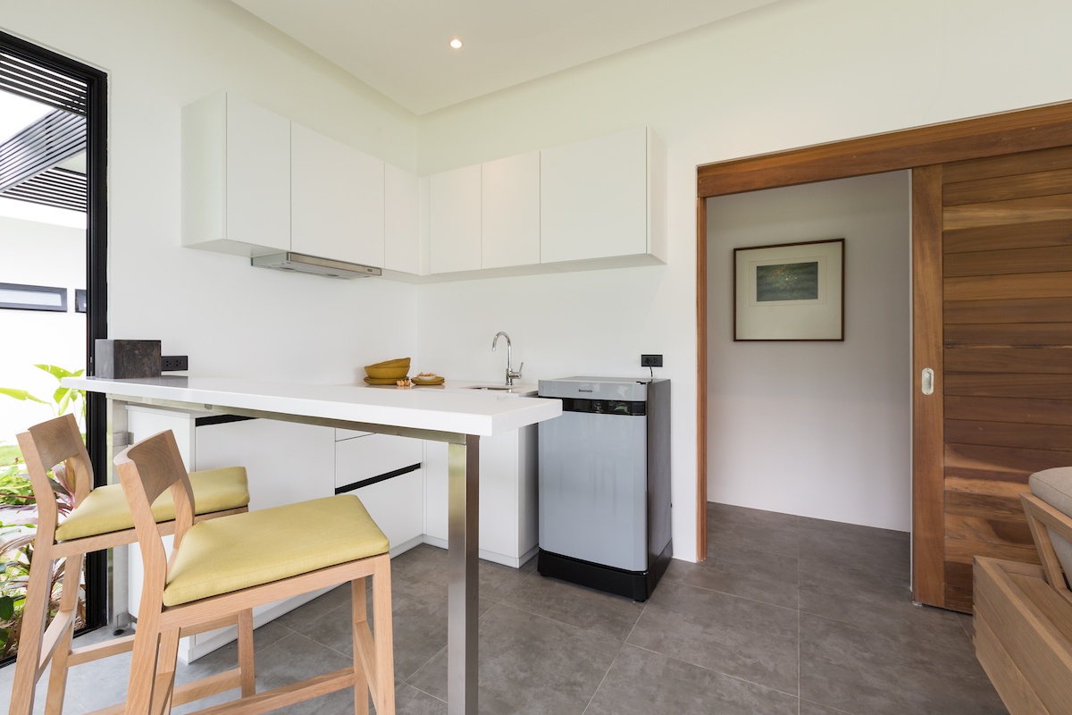 But now it’s time to turn around and explore everything Villa Thansamaay has to offer. And the first room, just metres from the beach, is really a ‘villa-within-a-villa’ as it has two bedrooms, a TV lounge and a small kitchenette with a breakfast bar, fridge, sink and cooking hob, perfect for mum, dad and a couple of little ones. And the main bedroom overlooks the ocean, the beach and the lower part of the garden. In all, five of the bedrooms overlook the ocean and two look on to the garden with ocean-views from their patios. All the bedrooms are en-suite with very generously sized bathrooms and all are fully air-conditioned with king-sized beds and plenty of storage spaces.